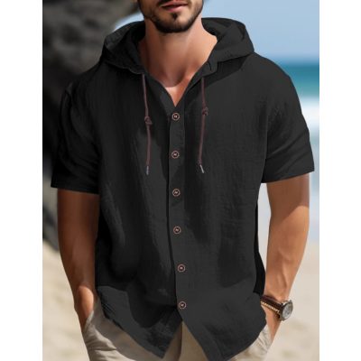 Men's loose fitting men's T-shirt solid color casual short sleeved shirt hooded drawstring imitation linen buckle cardigan