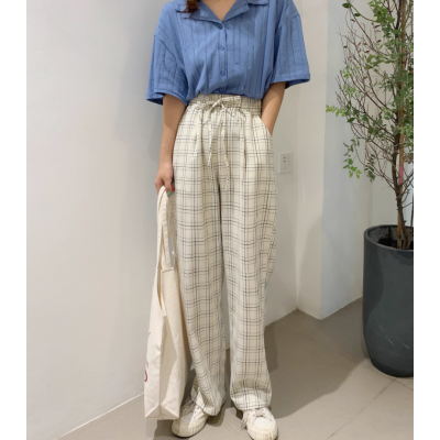 Autumn outfit Japanese Korean style chic light colored checkered elastic waist loose straight tube slimming versatile casual pants for women