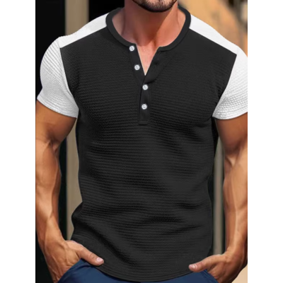 Summer new European and American men's plus size waffle T-shirt Henry shirt color blocked short sleeved men's clothing