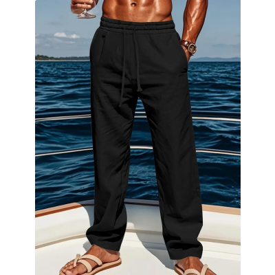 Men's casual pants drawstring simple and fashionable solid color casual cotton and linen straight leg pants for men