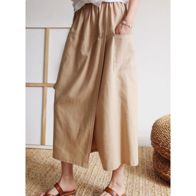 Japanese college style artistic style elastic waist cotton linen split skirt wide leg pants skirt pocket linen skirt